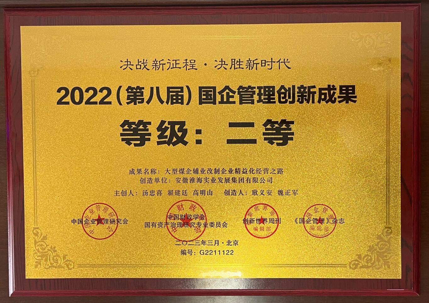 近日,2023國企管理智庫大會暨國企管理創新成果發布儀式在北京國際會議中心召開,淮海實業集團《大型煤企輔業改制企業精益化經營之路》創新案例榮獲2022(第八屆)國企管理創新成果二等獎。據悉,本次創新成果評選是在全國范圍內征集國企實踐成果和理論成果,旨在總結提煉國企管理典型經驗和創新做法,樹立樣本,形成一批可復制、可推廣、高質量、具有影響力的標志性成果,通過示范效應推動國企管理提升。集團公司作為“主輔分...
