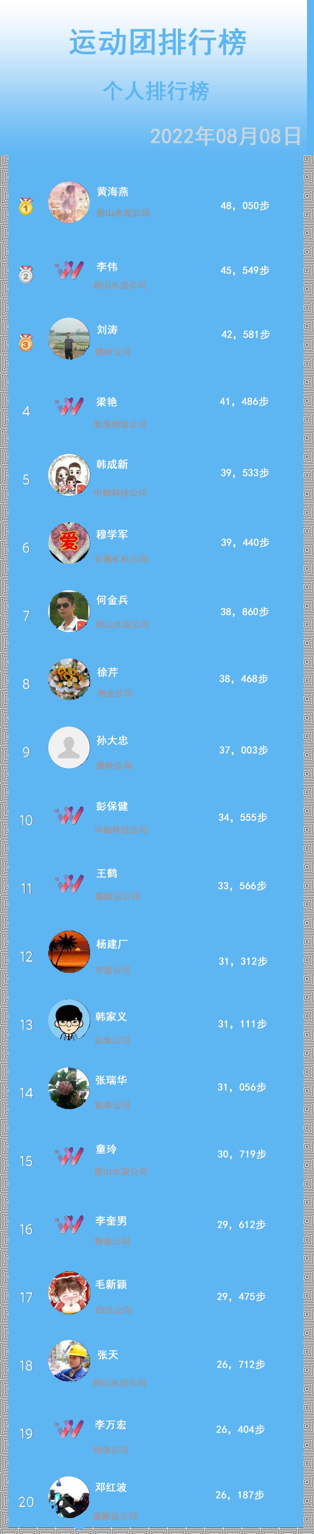 2022年8月8日是我國第14個“全民健身日”,集團公司工會組織開展“快樂工作、健康生活”全民健身主題活動。 此次活動以15000步為基礎步數(shù),不設上限。通過精彩角逐,黃海燕、李偉、劉濤等20人從2076名參與職工中脫穎而出。 集團公司工會將繼續(xù)開展全民健身、快樂健身各類活動,豐富廣大職工的業(yè)余生活,通過強身健體鼓足職工干勁,凝聚職工力量促發(fā)展,以奮進者的昂揚姿態(tài)迎接黨的二十大勝利召開。(杜薇