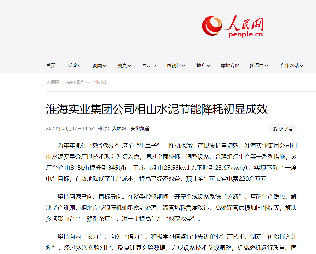 淮海實業集團公司相山水泥節能降耗初顯成效
