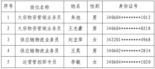 淮海物流公司于2023年1月11日開展招聘工作,經過現場面試和考察,現將雙方達成就業意向、擬錄用人員名單公告如下: