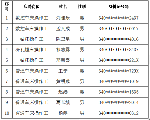 安徽省礦業機電裝備有限責任公司于2023年6月30日發布招聘公告、開展招聘工作,經過面試、考察、體檢和集體研究,現將擬錄用人員名單公告如下: