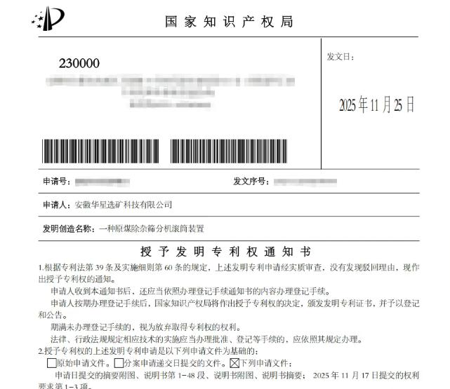 日前,華星公司自主研發的“一種原煤除雜篩分機滾筒裝置”正式獲得國家發明專利授權。這不僅是一項技術突破,更為該公司“十五五”發展筑牢創新基石。