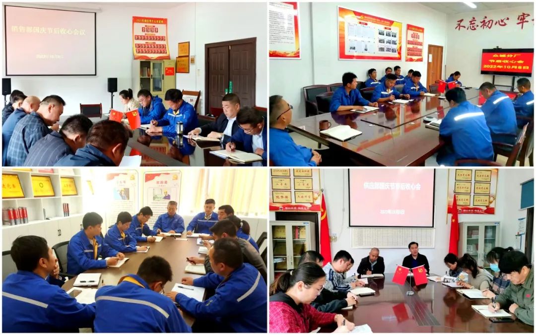 國慶假期結束,集團公司采取召開晨會、專題會議、舉行升旗儀式等形式,教育引導廣大干部職工迅速收心歸位,脫離休假狀態,進入工作角色,擺脫“節后綜合征”,以最佳的精神狀態、飽滿的工作熱情迅速投入到決戰四季度、奮戰全年目標的工作當中。