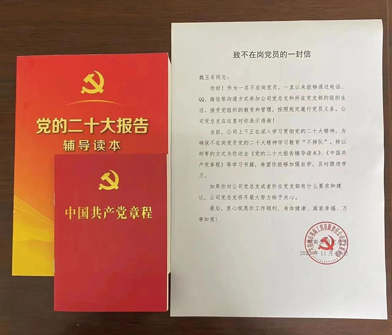 該公司黨總支分別走訪3位黨員,贈與《黨的二十大報告輔導(dǎo)讀本》、《中國共產(chǎn)黨章程》等學(xué)習(xí)材料,并通過話發(fā)展、談變化,深入學(xué)習(xí)領(lǐng)會黨的二十大提出的新思想、新理論,作出的新部署、新要求,切實把思想和行動迅速統(tǒng)一到黨的二十大精神上來。大家紛紛表示,要深刻認(rèn)識和把握此次大會的精髓實質(zhì),履行好新時代新征程的使命任務(wù),推動黨的二十大精神在基層落地生根、開花結(jié)果。此外,該黨總支還制作致不在崗黨員一封信,聽取不在崗黨員對工作的意見和建議,鼓勵他們?yōu)楣景l(fā)展建設(shè)“支招”、出力。