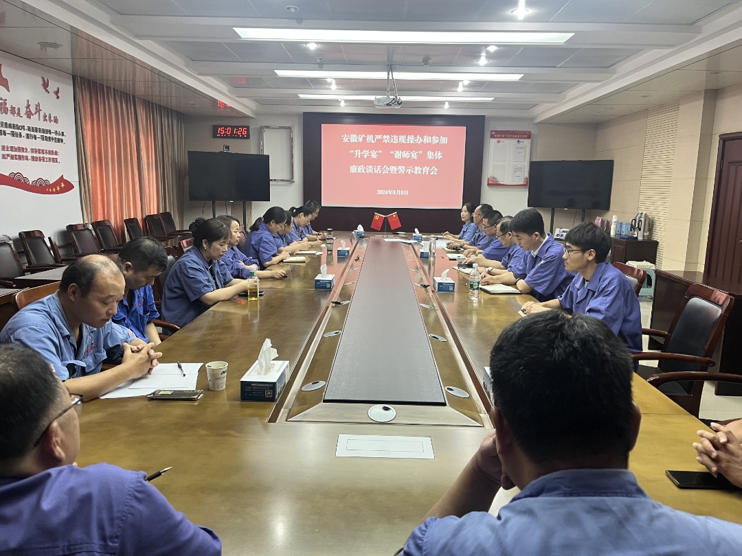 8月8日,安徽礦機黨委舉行集體廉政提醒談話,面向20名有子女升學的黨員干部,就嚴格貫徹落實中央八項規定精神,堅決不操辦“升學宴”“謝師宴”,提出有關要求,打“預防針”,劃“警戒線”,抓早抓小、防微杜漸,防范廉潔風險事件發生。