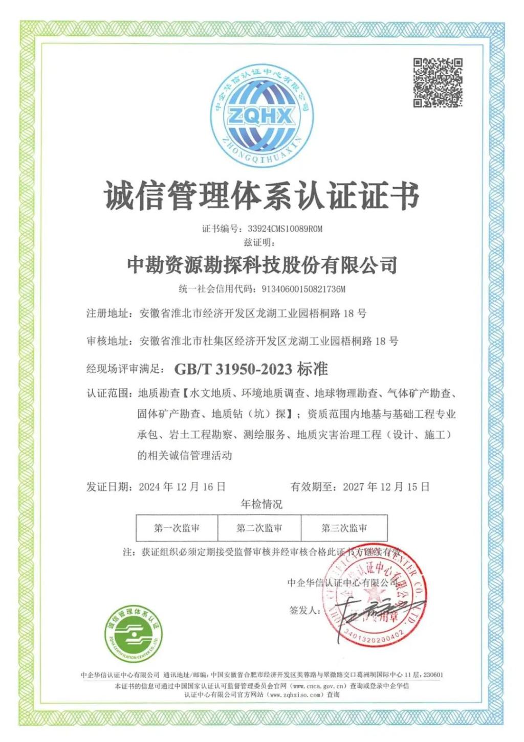 12月15日,筆者了解到,中勘科技順利通過誠信管理體系認證審核,標志該公司在“誠信經營、信息披露、合同履行、售后服務”等方面的工作業績,獲得權威機構認可,有助于進一步增加客戶信任,增強競爭優勢,提升企業品牌形象和市場競爭能力。