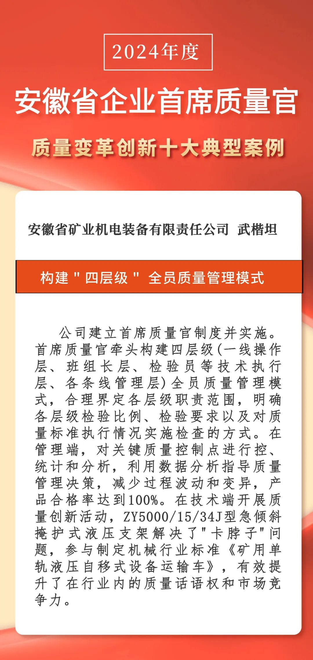 近日,安徽省市場監(jiān)督管理局發(fā)布“2024年度企業(yè)首席質量官質量變革創(chuàng)新”十大典型案例,淮海實業(yè)集團《“四層級”全員質量管理模式》成功入選。